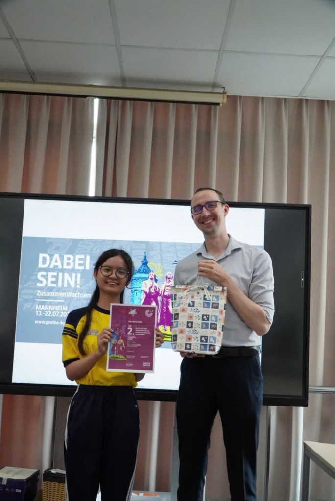 An dem Wettbewerb nahmen 6 Kandidat:innen mit Deutschniveau A2 aus verschiedenen Schulen des vom Goethe-Institut unterstützten PASCH-Projekts teil. Der Wettbewerb war total spannend. Die Kandidat:innen haben nicht nur ihre Deutschkenntnisse, sondern auch ihr Selbstvertrauen, ihre Kreativität und effektive Teamfähigkeiten dargestellt. Nach zwei Runden (Einzel-und Gruppenarbeit) wurden die zwei exzellenten Schüler:innen aus der Nguyen Thuong Hien Oberschule mit folgenden Preisen ausgezeichnet: